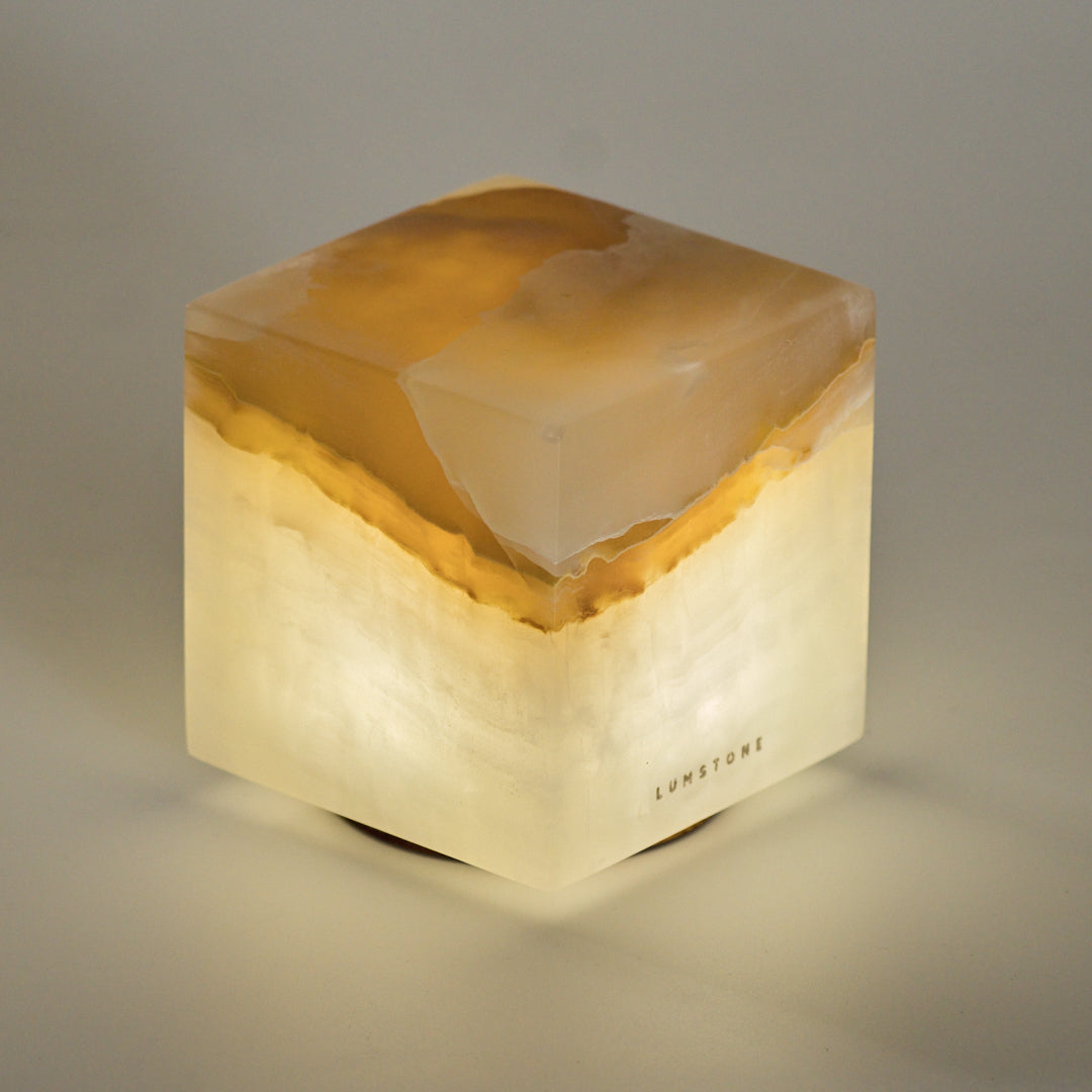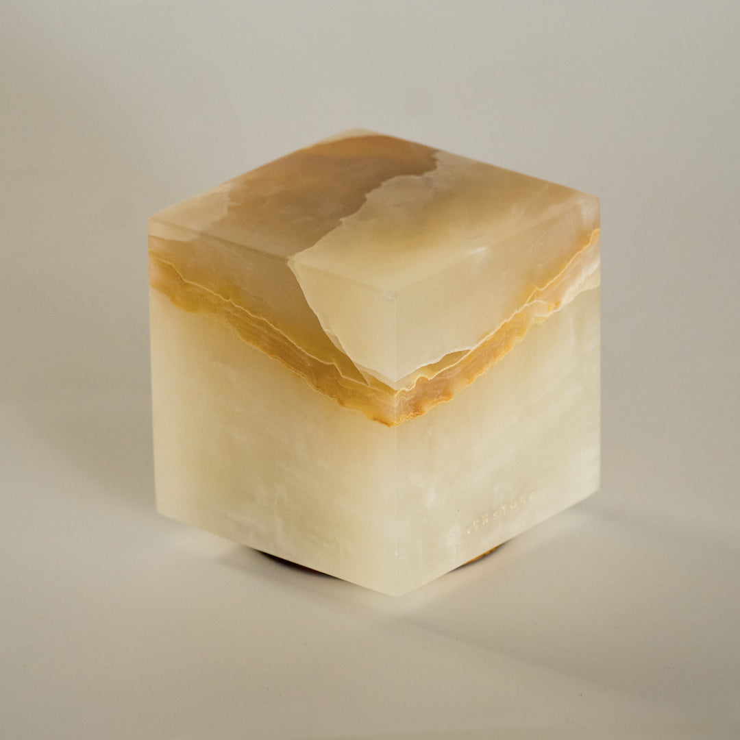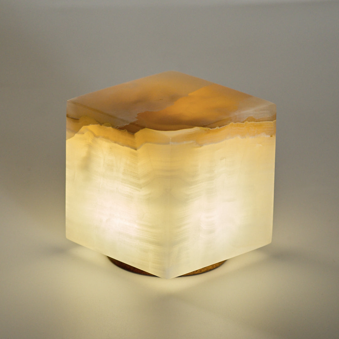 Pieza iluminaria con un diseño elegante y único hecha a mano con elementos naturales. La principal propiedad de esta lámpara es el cubo de mármol ónix, su transparencia y tonalidades permiten generar una luz cálida y decorativa. Cada pieza es única y contiene características especiales. La forma más práctica de llevar luz natural a tu rutina.