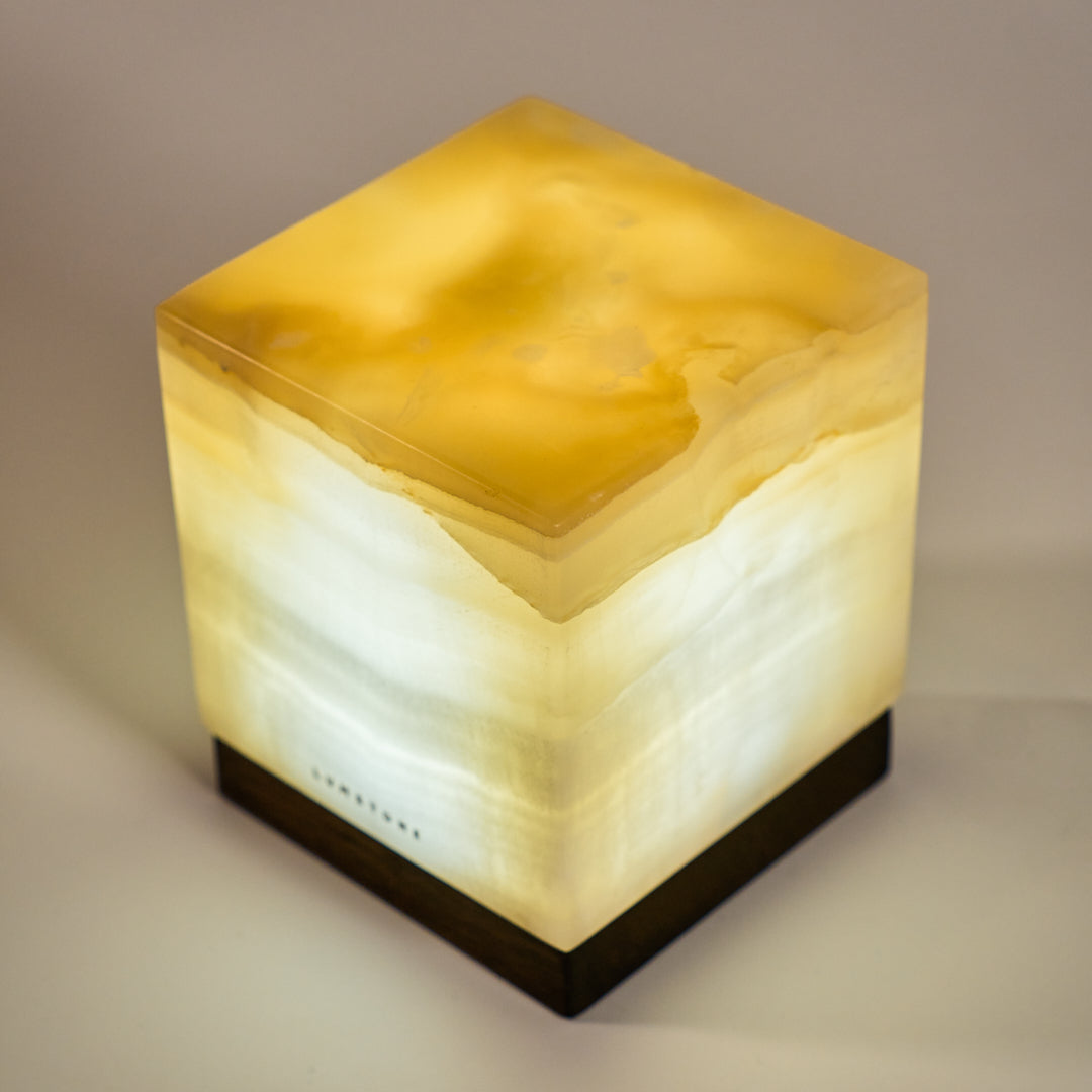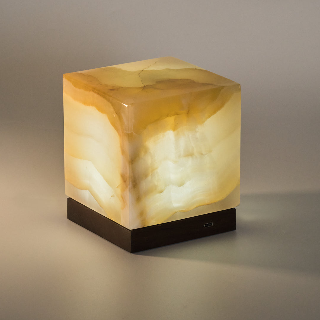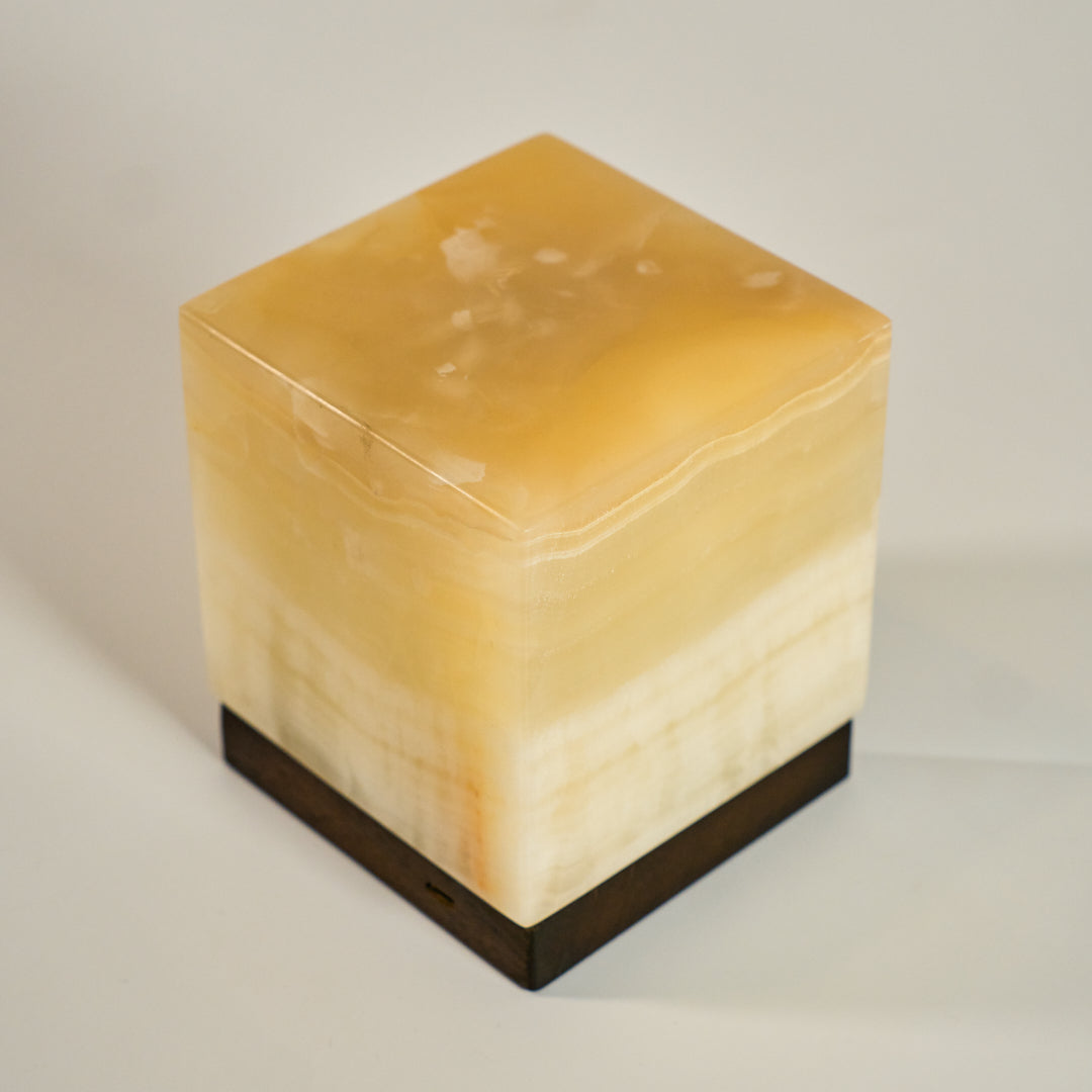 Pieza iluminaria con un diseño elegante y único hecha a mano con elementos naturales. La principal propiedad de esta lámpara es el cubo de mármol ónix, su transparencia y tonalidades permiten generar una luz cálida y decorativa. Cada lámpara está fabricada con piedra ónix auténtica, sin aditivos ni pigmentos artificiales