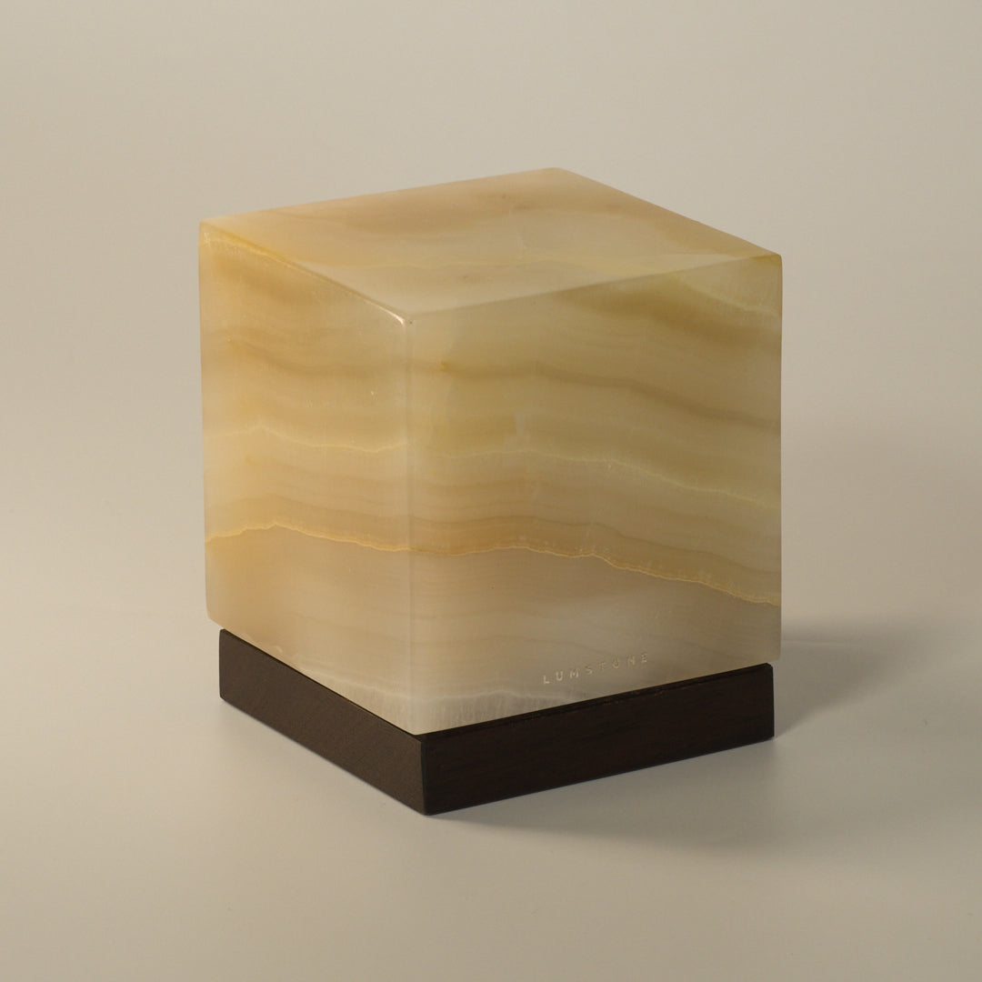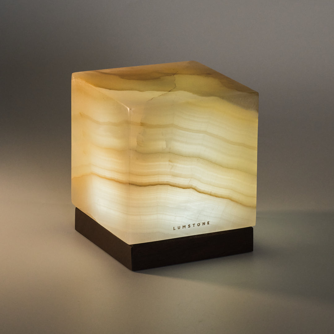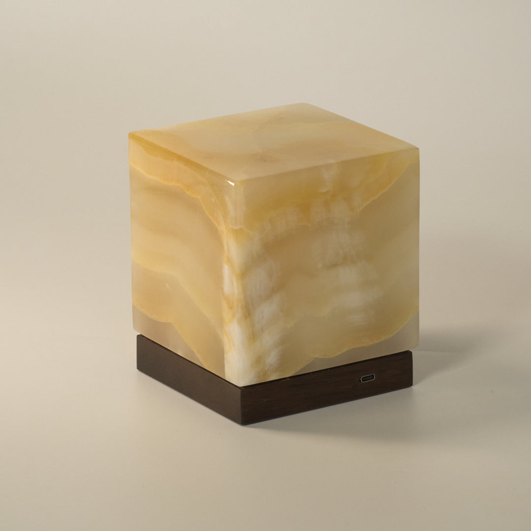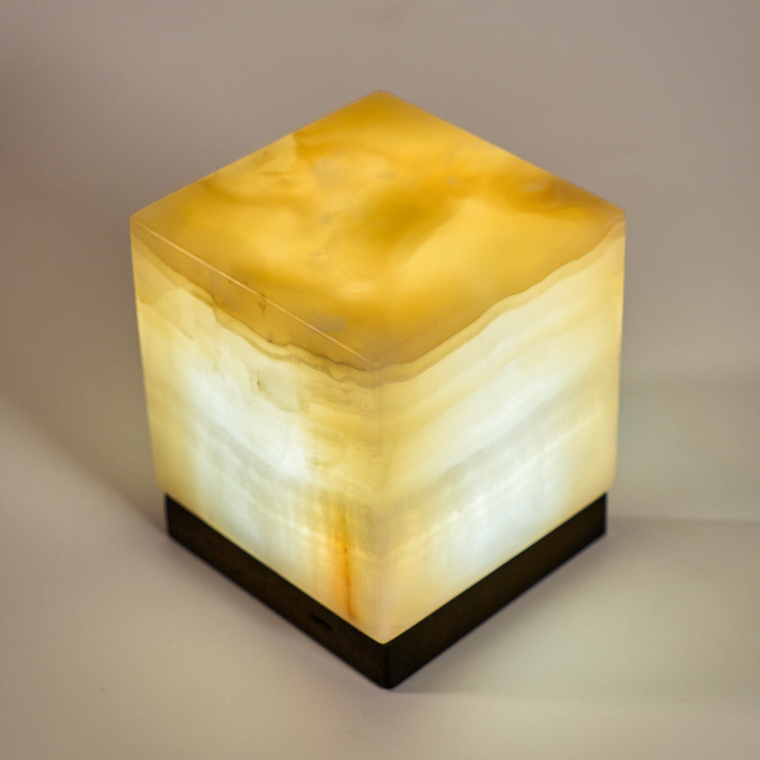Pieza iluminaria con un diseño elegante y único hecha a mano con elementos naturales. La principal propiedad de esta lámpara es el cubo de mármol ónix, su transparencia y tonalidades permiten generar una luz cálida y decorativa. Cada lámpara está fabricada con piedra ónix auténtica, sin aditivos ni pigmentos artificiales