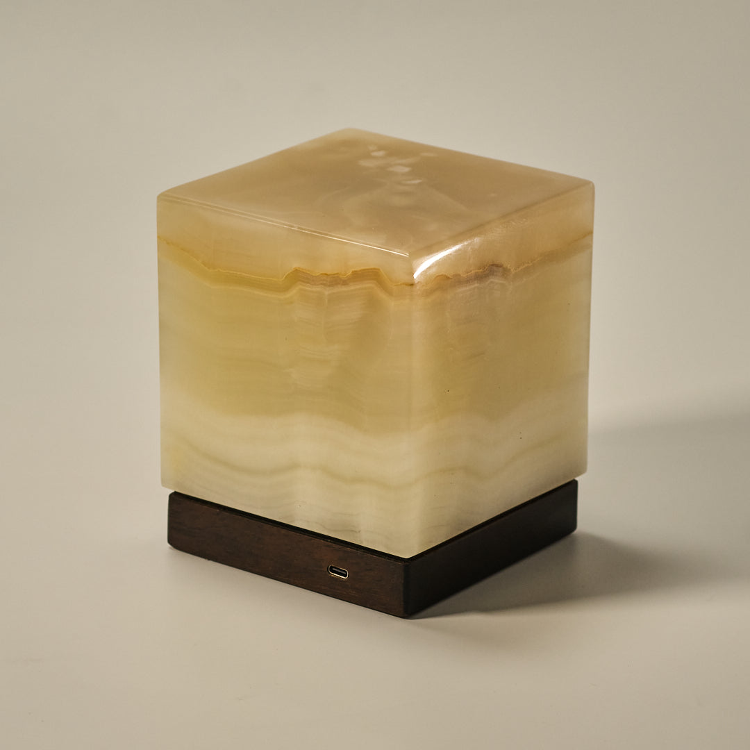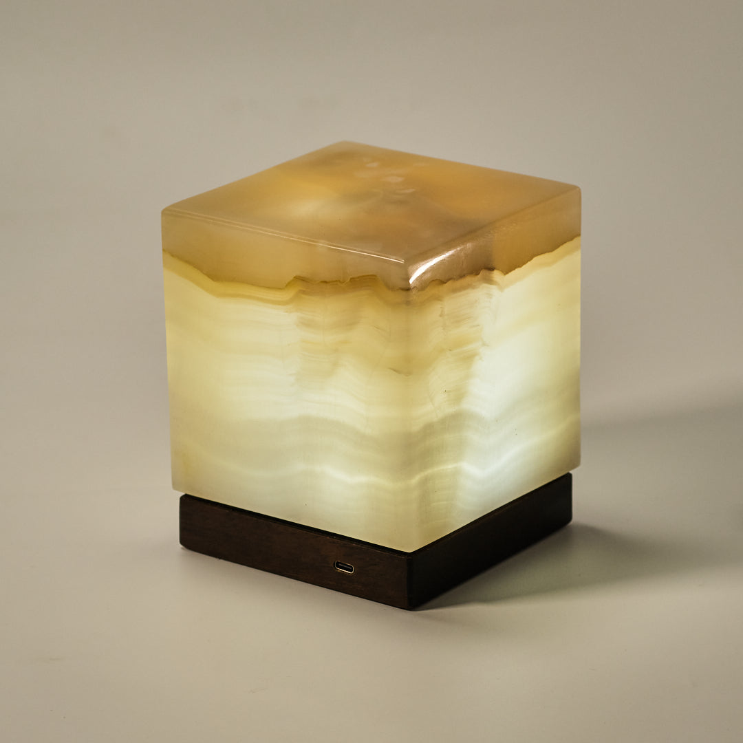 Pieza iluminaria con un diseño elegante y único hecha a mano con elementos naturales. La principal propiedad de esta lámpara es el cubo de mármol ónix, su transparencia y tonalidades permiten generar una luz cálida y decorativa. Cada lámpara está fabricada con piedra ónix auténtica, sin aditivos ni pigmentos artificiales. Cada pieza es lijada y pulida manualmente, garantizando precisión en su terminación.