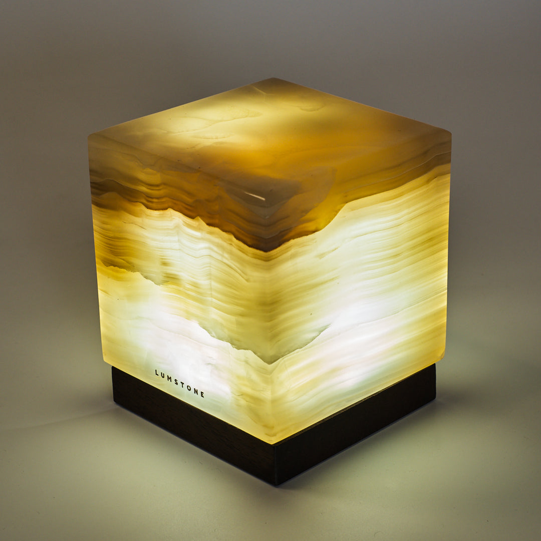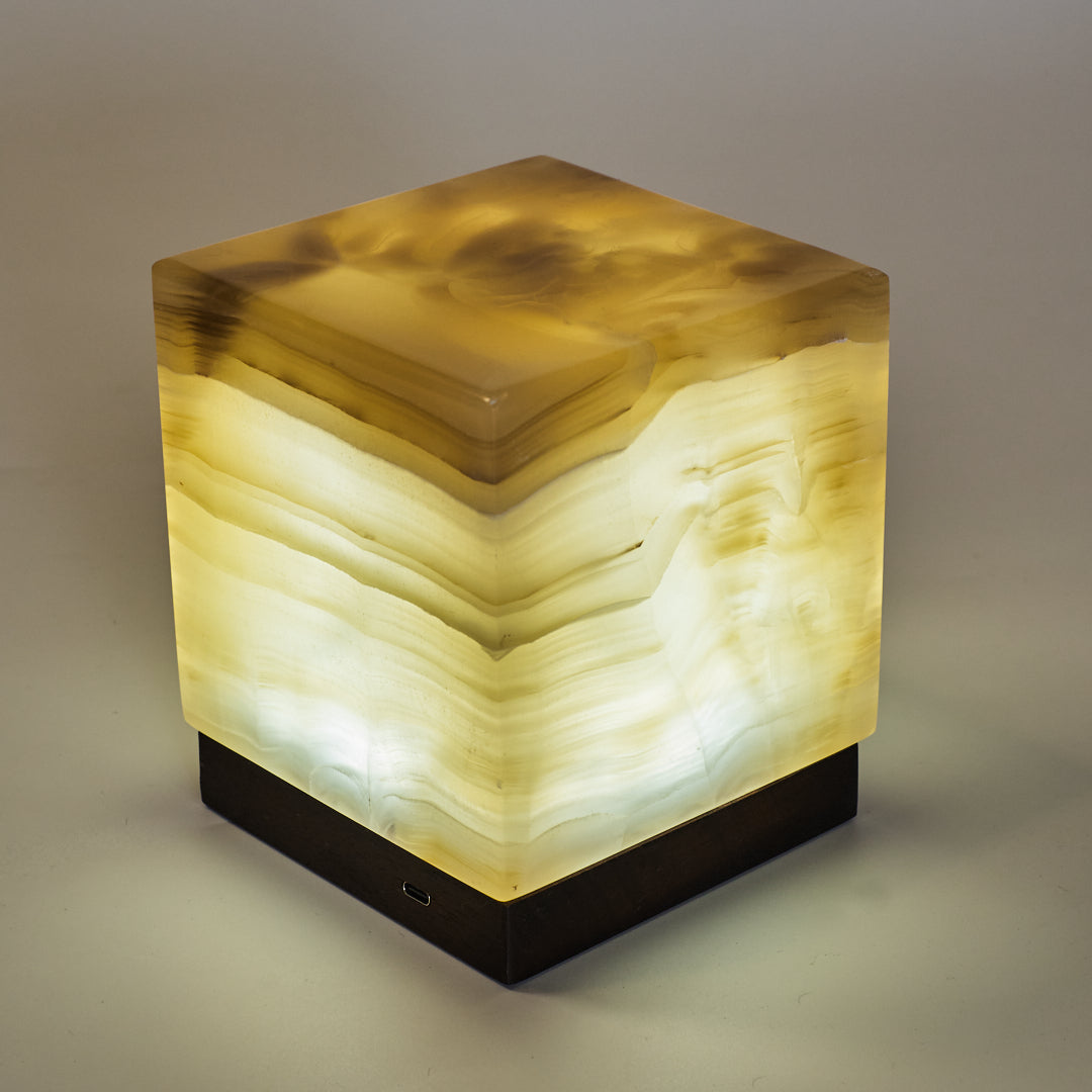 Pieza iluminaria con un diseño elegante y único hecha a mano con elementos naturales. La principal propiedad de esta lámpara es el cubo de mármol ónix, su transparencia y tonalidades permiten generar una luz cálida y decorativa.  Cada lámpara está fabricada con piedra ónix auténtica, sin aditivos ni pigmentos artificiales