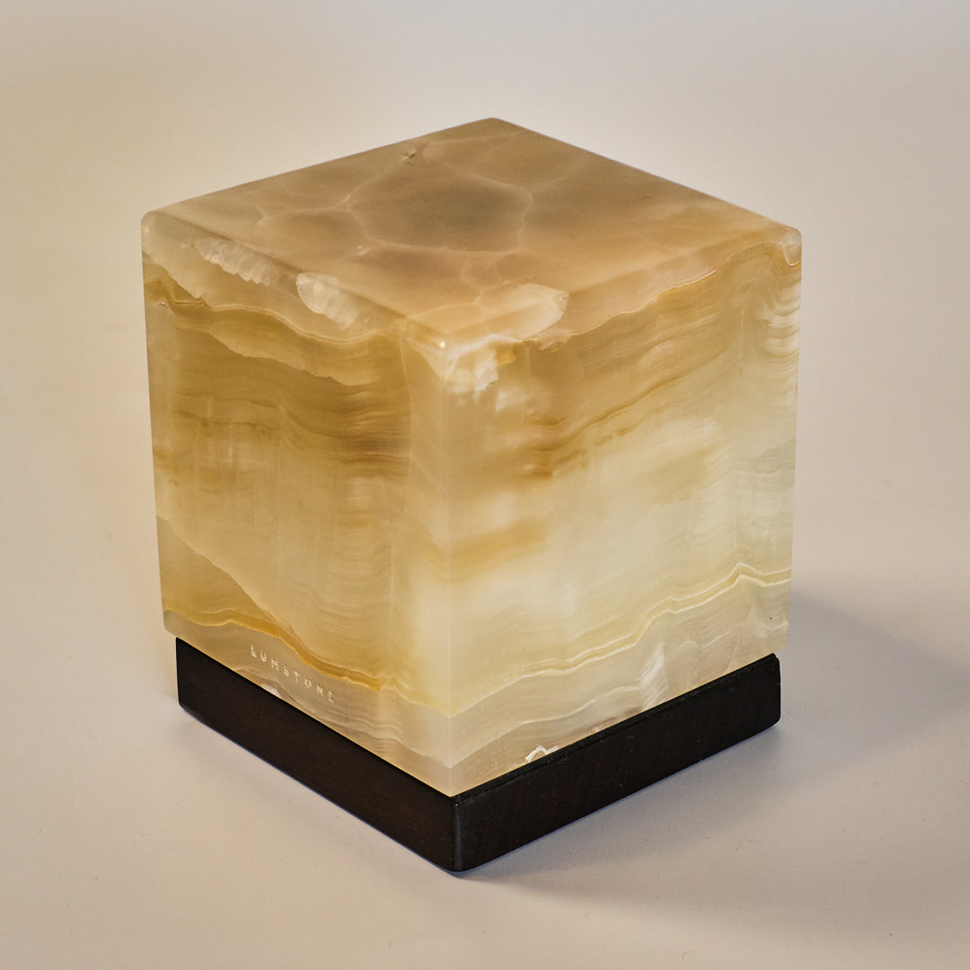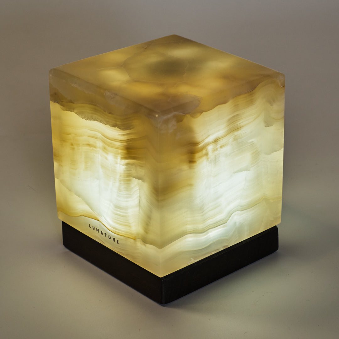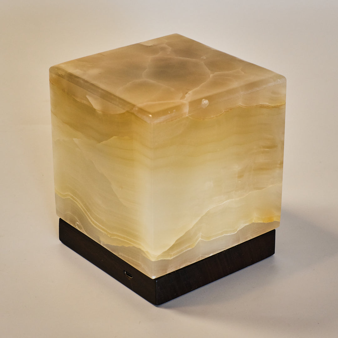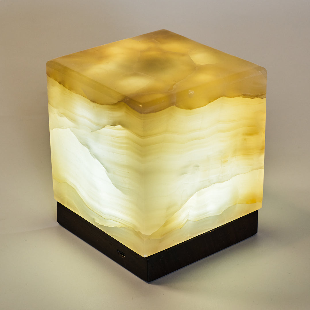 Pieza iluminaria con un diseño elegante y único hecha a mano con elementos naturales. La principal propiedad de esta lámpara es el cubo de mármol ónix, su transparencia y tonalidades permiten generar una luz cálida y decorativa.  Cada lámpara está fabricada con piedra ónix auténtica, sin aditivos ni pigmentos artificiales